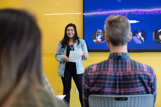 In support of this program Pitch Lab was invited in for a special “Laugh & Learn” workshop where attendees had the opportunity to receive actionable feedback on how to improve their timing, delivery and room command.